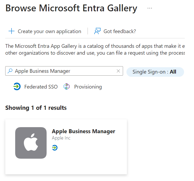 - Szükségünk van egy Enterprise App-ra az Azure-ben, hogy a user provision végbe tudjon menni. Apple Business Manager néven találod meg az Enterprise Appot.