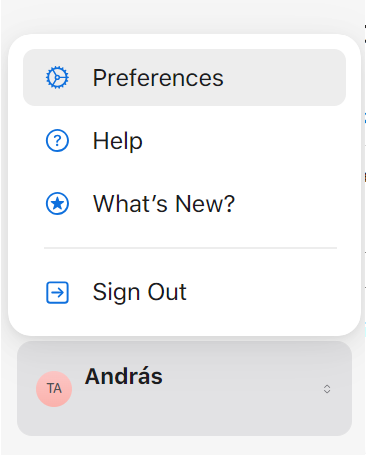 - A bal alsó sarokban kattintsunk a nevünkre, majd a “Preferencies” menüre: