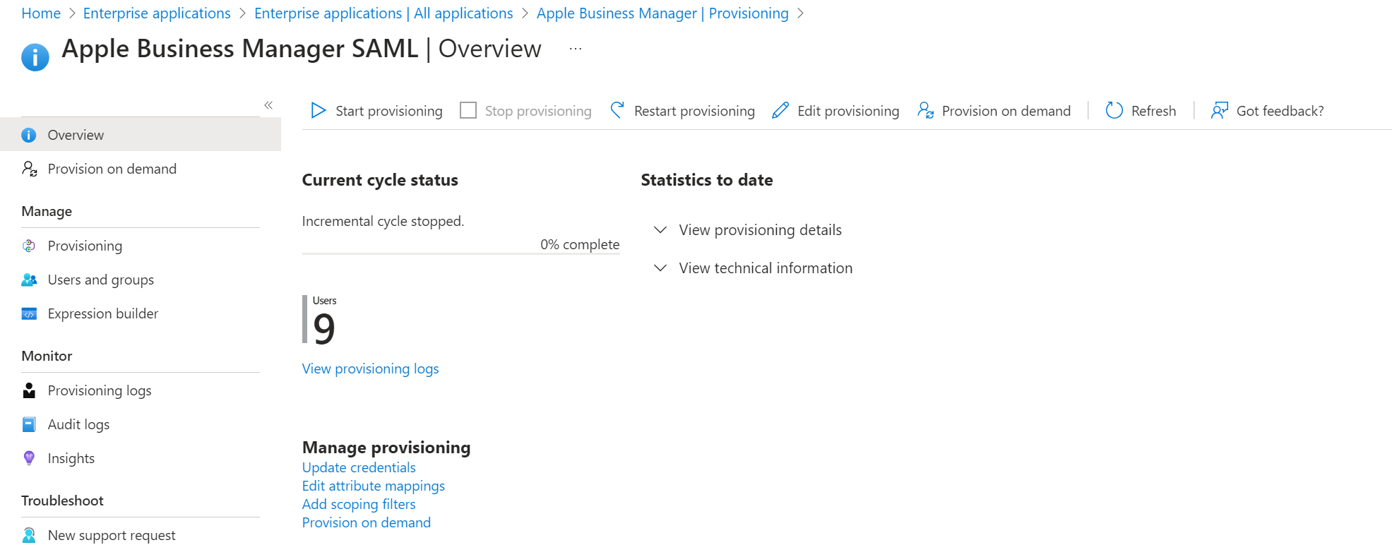 - Az SCIM token és a user mapping beállítása után, nincs más dolgunk mint megygőződni róla, hogy a teszt userünk tagja a csoportnak amit definiáltunk az app hozzáférésénél, és kezdődhez a provisioning! Fontos, hogy olyan felhasználót adjunk csak a csoporthoz, akinek még nincsen Managed Apple ID-ja! Admin roleal rendelkező felhasználó az ABM-ben nem lehet federált, így minden admin accountot kézzel kell létrehozni az ABM felületén. Azure MFA-t így nem tudunk használni, az Apple féle MFA-t tudjuk használni ami SMS alapú vagy yubikey-t is lehet már használni de erre most nem térek ki. Erről itt olvashatsz bővebben: LINK