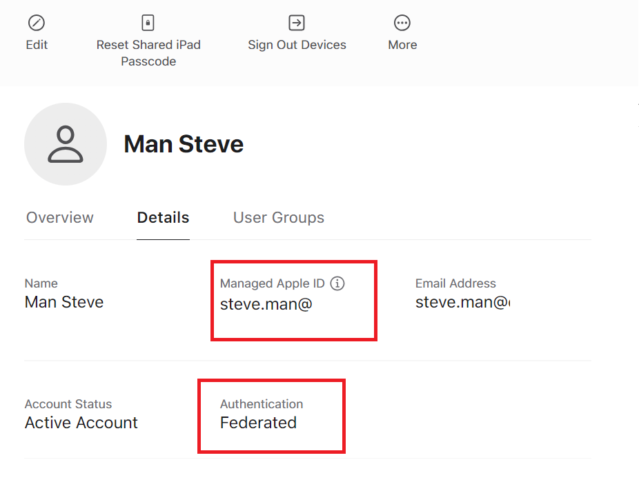Mint a képen is látható az Authentikáció “Federated” értéket kap, innentől az Azure végzi az authentikációt még akkor is ha a felhasználó az icloud.com-ra lép be. Igény esetén használhatunk Conditional Accesst! Másik fontos dolog, igaz ez a képen nem látszik de a felhasználóhoz tartozó Managed Apple ID, egyszerűen a céges email cím!