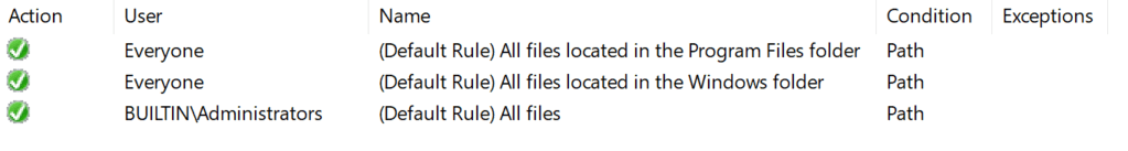 <FilePathRule Id="fd686d83-a829-4351-8ff4-27c7de5755d2" Name="(Default Rule) All files" Description="Allows members of the local Administrators group to run all applications." UserOrGroupSid="S-1-5-32-544" Action="Allow">