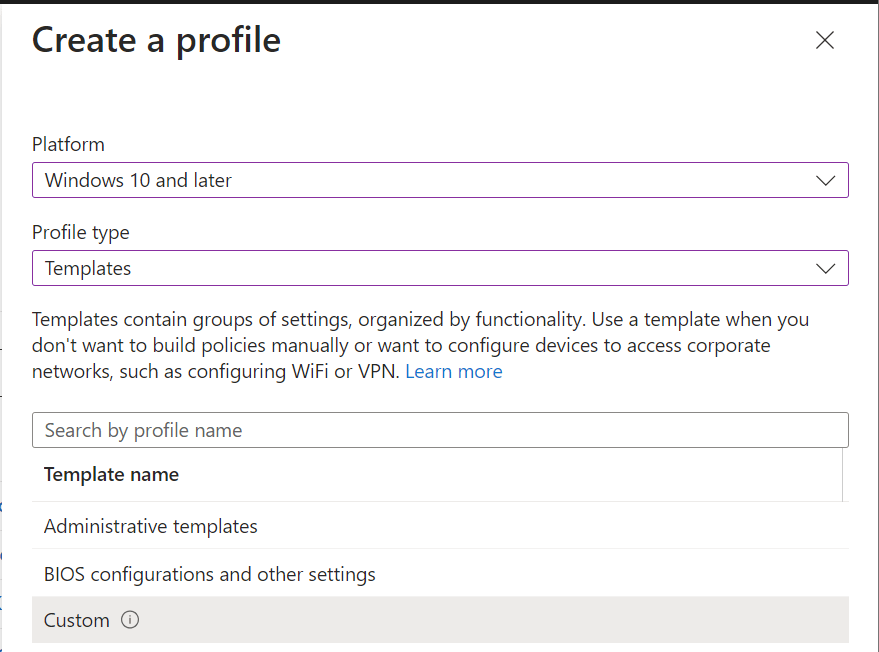 Hozzuk létre a policynkat az Intune-ban. Egy custom profile-ra lesz szükségünk: