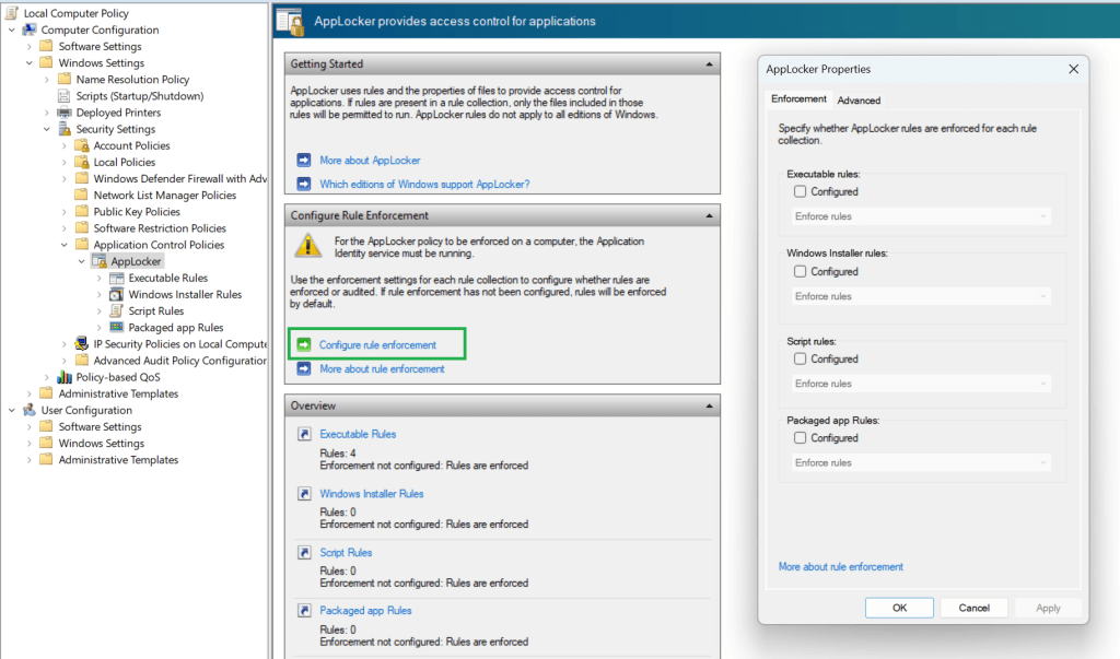 Az Enforcement beállításokat egyébként a Group Policy manager-ben az “AppLocker” menüre kattintva tudjuk ellenőrizni a “Configure rule enforcement” alatt.: