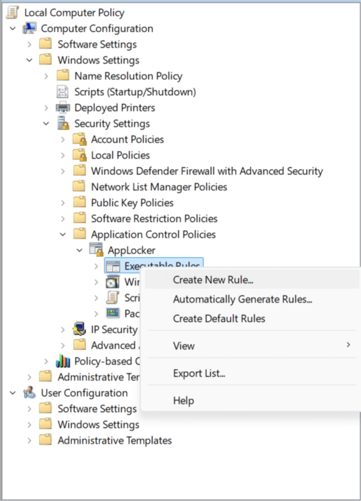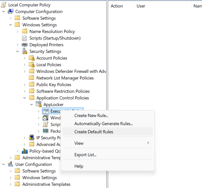 Első lépés, hogy létre kell hoznunk a “Default Rule”-okat. Ezt a Computer Configuration -> Windows Settings -> Security Settings -> Application Control Policies ->AppLocker -> Executable Rules menüre kattintva tudjuk megtenni.