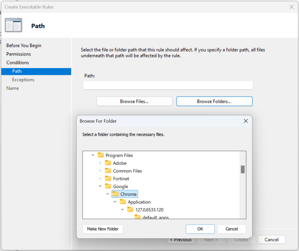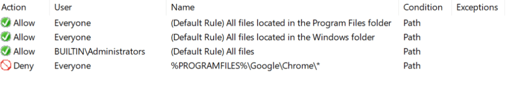 <FilePathRule Id="abd69c2d-9847-4208-bdcf-0e0a710b546e" Name="%PROGRAMFILES%\Google\Chrome\*" Description="" UserOrGroupSid="S-1-1-0" Action="Deny">