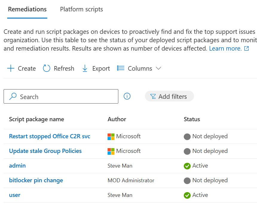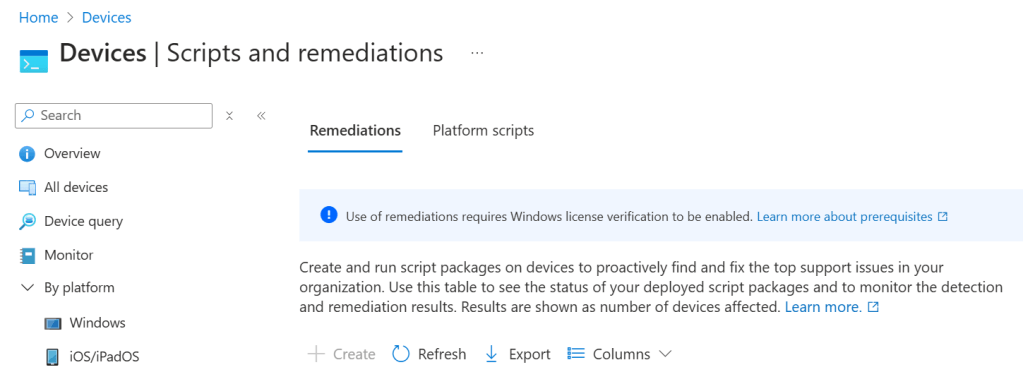 A napokban migrálnom kellett egy Intune tenantból egy másik (új) Intune tenantba konfigurációs profilokat, scripteket és alkalmazásokat. Miután a migráció megtörtént nem tudtam új scriptet feltölteni a Remediation scriptek közé, mert a “+Create” gomb szürke volt, és a következő üzenetet kaptam:
