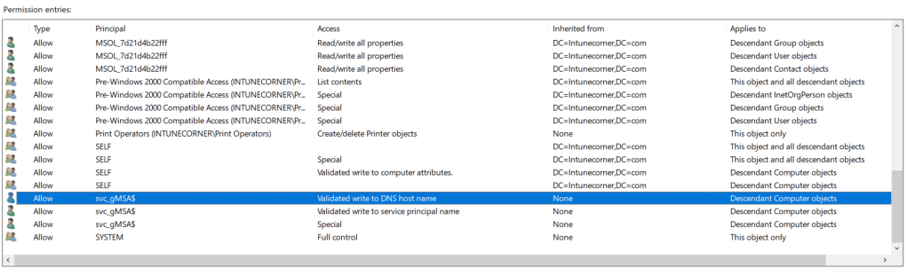 # Végigmegyünk a rights listán, és minden jogosultságot hozzáadunk az OU-hoz a gMSA nevében.