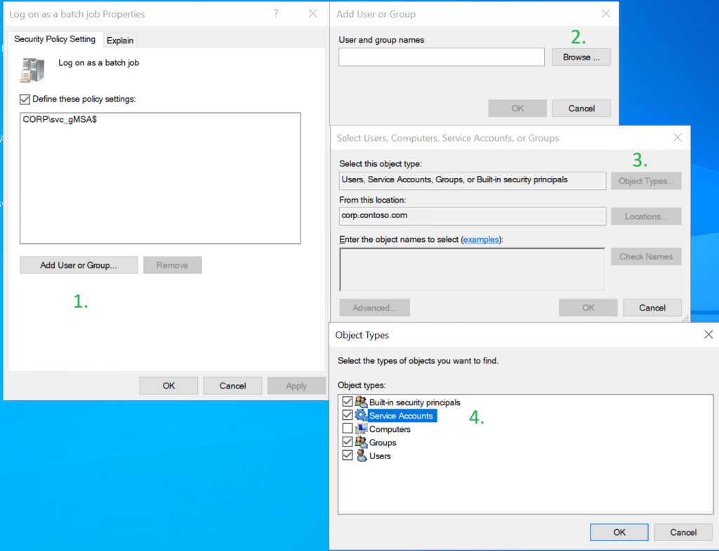 3. megfelelő jogosultság a gMSA account számára a klienseket tartalmazó OU-ra