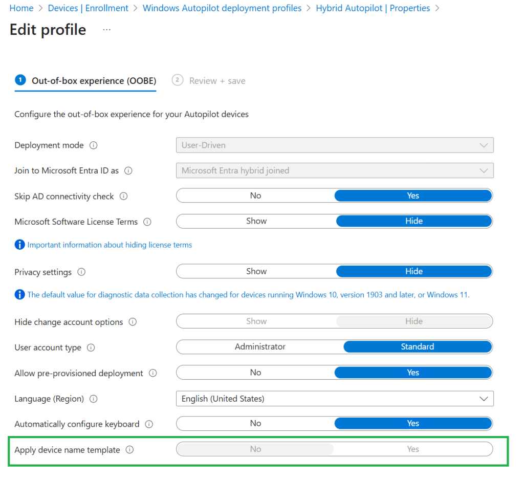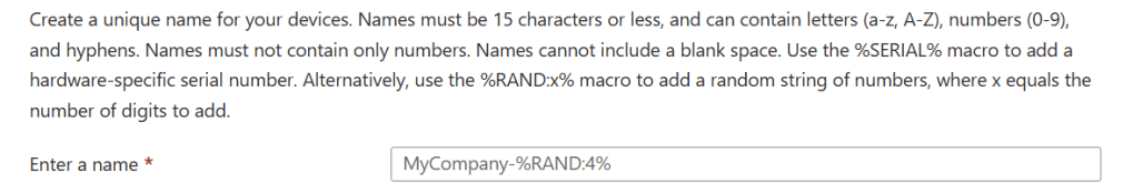 AutoPilot (Cloud Only) deployment profil konfigurálásánál lehetőség van Device name template megadására is, melyet az alábbiak szerint végezhetünk el: