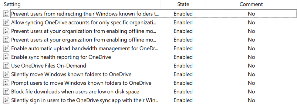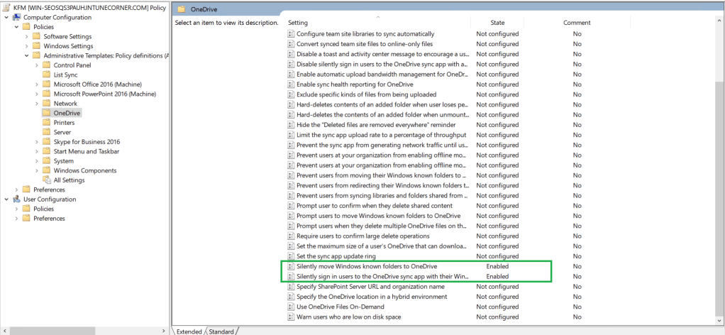 A KFM beállításokat a Computer Configuration – Policies – Administrative Templates – OneDrive útvonalon találod. A fenti képen jelöltem azokat a beállításokat amiket Enabled státuszba kell konfigurálni.