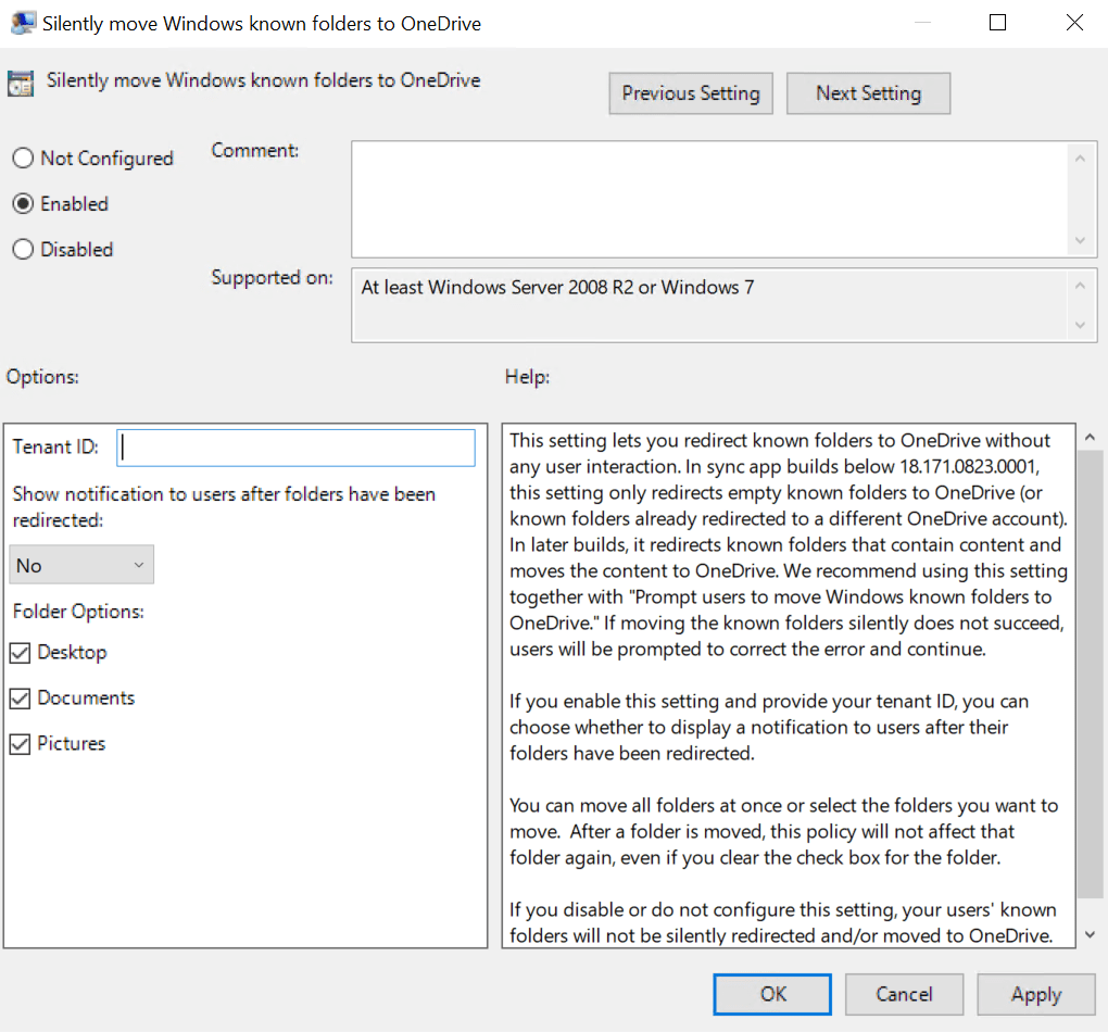 Fontos, hogy a “Silently move Windows known folders to OneDrive” beállításnál szükséges megadni a tenant ID-t: