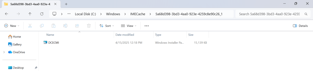 Mikor a DCECMI agent települ, átmenetileg a C:\Windows\IMECache\”5a68d398-3bd3-4aa0-923e-4259c8e90c26″ mappába kerül letöltésre, a telepítési próbálkozás után a fájl törlődik.