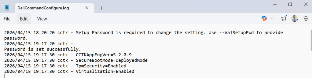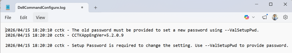 A DellCommandConfigure.log fájlban látjuk, hogy nem tudta a jelszót cserélni mert nem találja a régi jelszót: