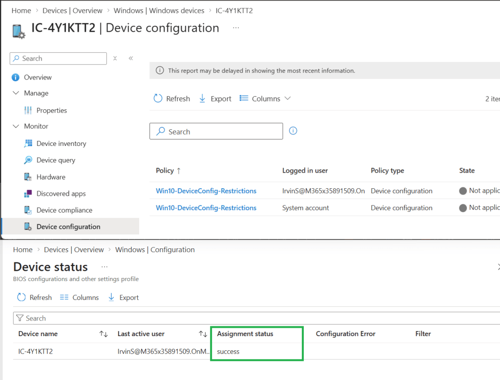 Deployoljuk a policy-t a teszt eszközünkre, majd ellenőrizzük a deployment sikerességét. Azt vettem észre, hogy a policy nem látszik az eszköznél, így csak a policy reportjában látjuk, hogy sikeres-e a deployment.