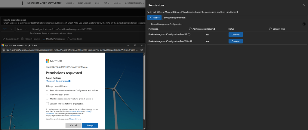 - Adjuk meg a szükséges app consentet a Graph Explorer-nek, hogy ki tudja olvasni a jelszavakat: