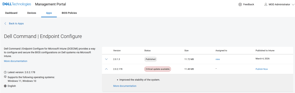 Ez jelentősen leegyszerűsíti az alkalmazás életciklus-kezelését, mert így mikor új verzió jelenik meg a Dell Command Endpoint Configure alkalmazásból nem kell manuálisan elkészíteni a csomagot, egyszerűen csak publikálni kell Intune-ba, majd cserélni az assignment-et a régi verzióról az új verzióra: