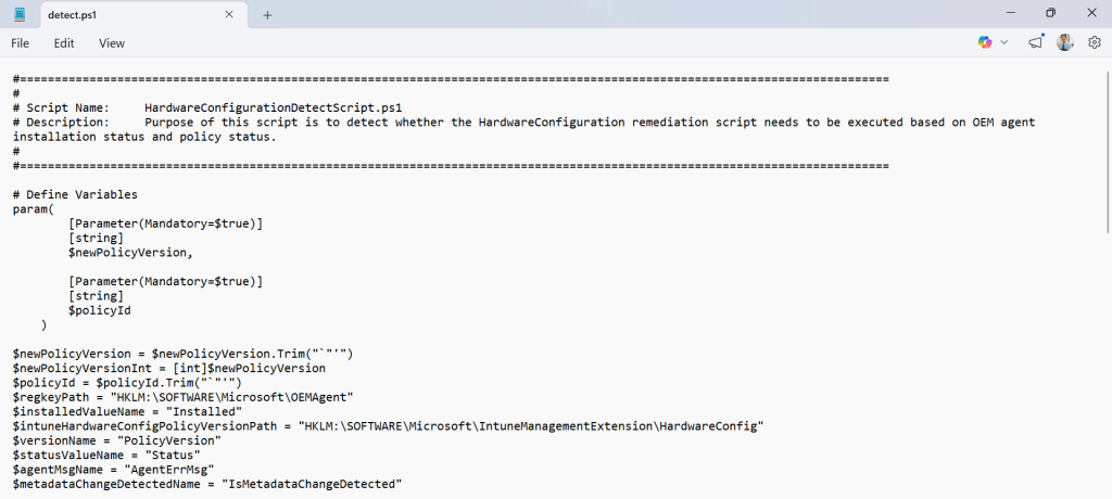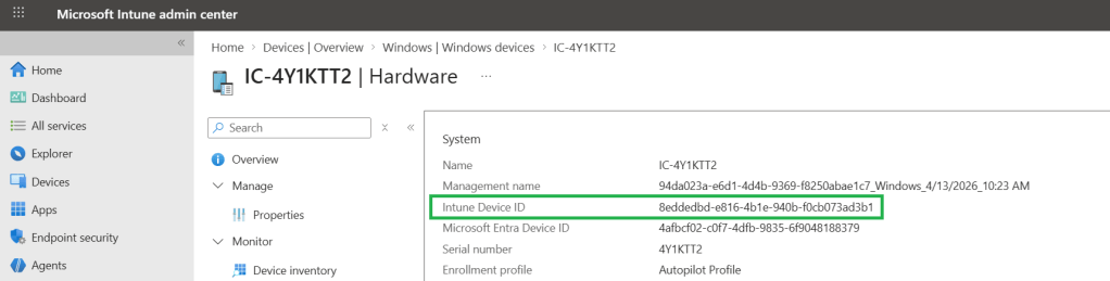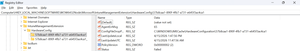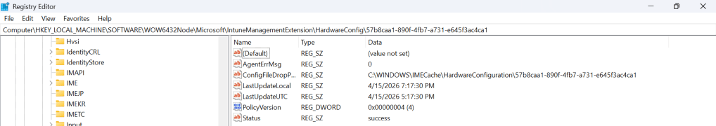 - HKLM:\SOFTWARE\Microsoft\IntuneManagementExtension\HardwareConfig\\PolicyVersion