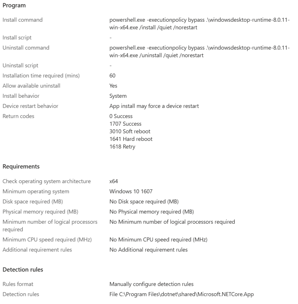 powershell.exe -executionpolicy bypass .\windowsdesktop-runtime-8.0.11-win-x64.exe /uninstall /quiet /norestart - Install behavior: System