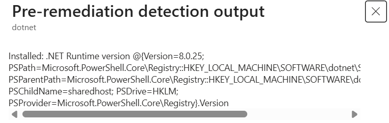 # .NET Runtime 8 remediation$dotnetKey = Get-ItemProperty -Path "HKLM:\SOFTWARE\dotnet\Setup\InstalledVersions\x64\sharedhost" -Name "Version" -ErrorAction SilentlyContinuetry { winget install --silent --exact --accept-source-agreements --accept-package-agreements Microsoft.DotNet.Runtime.8}catch { Write-Output "Winget execution failed: $_" exit 1}Start-Sleep -Seconds 10# Check after install$dotnetKey = Get-ItemProperty -Path "HKLM:\SOFTWARE\dotnet\Setup\InstalledVersions\x64\sharedhost" -Name "Version" -ErrorAction SilentlyContinueif ($dotnetKey) { Write-Output "SUCCESS: Installed .NET Runtime $dotnetKey.Version" exit 0}else { Write-Output "FAILED: .NET Runtime 8 installation did not succeed" exit 1}