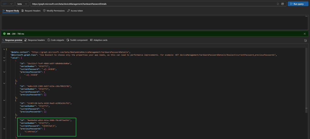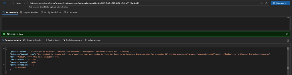 Ha device specifikusan szeretnénk keresni: https://graph.microsoft.com/beta/deviceManagement/hardwarePasswordDetails/{DeviceID}