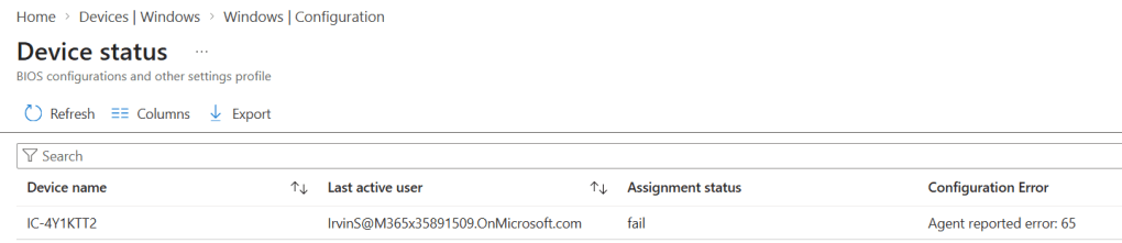 Itt látszik az is, hogy a “Status” értéke “Failed“, tehát sikertelen volt a deployment. Ezt az Intune policy report felülete is megerősíti: