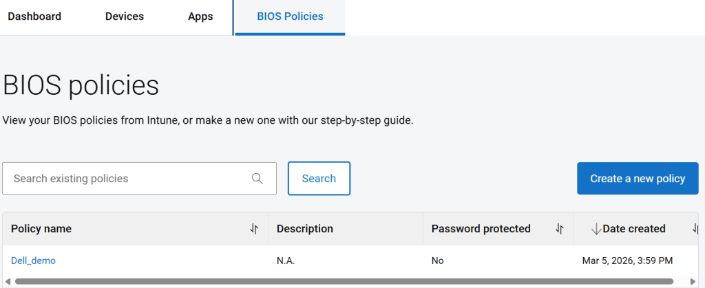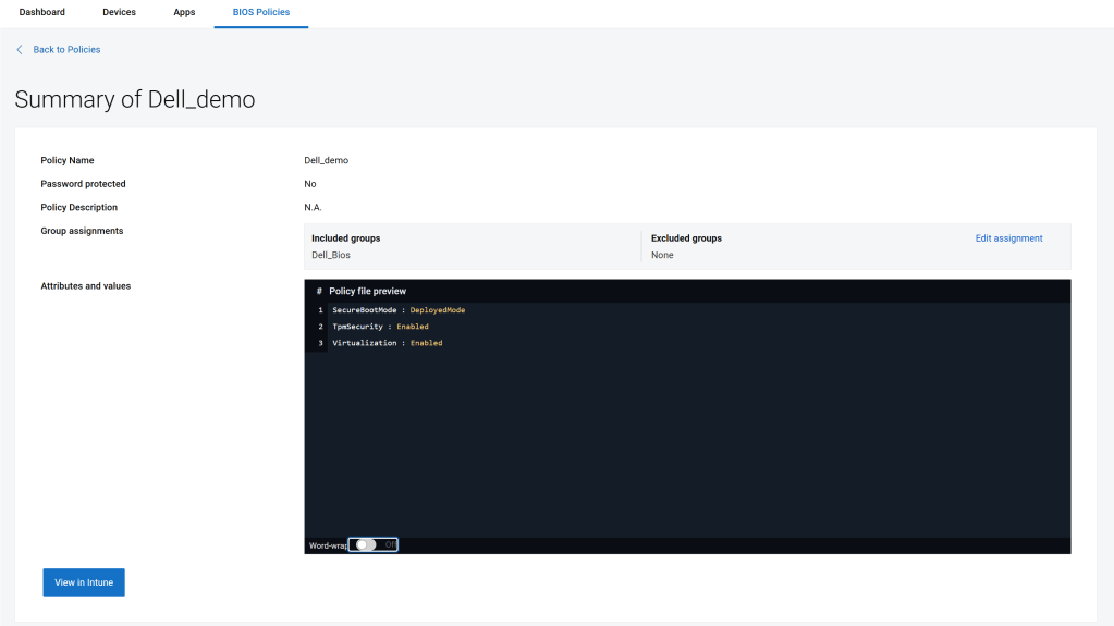 Hogyha összekapcsoltuk a Dell Management Portállal az Intune-t, a “BIOS Policies” menüben látni fogjuk az imént deployolt konfigurációt. Sajnos az Intune web GUI-n ezeket a beállításokat nem látjuk deployment után.